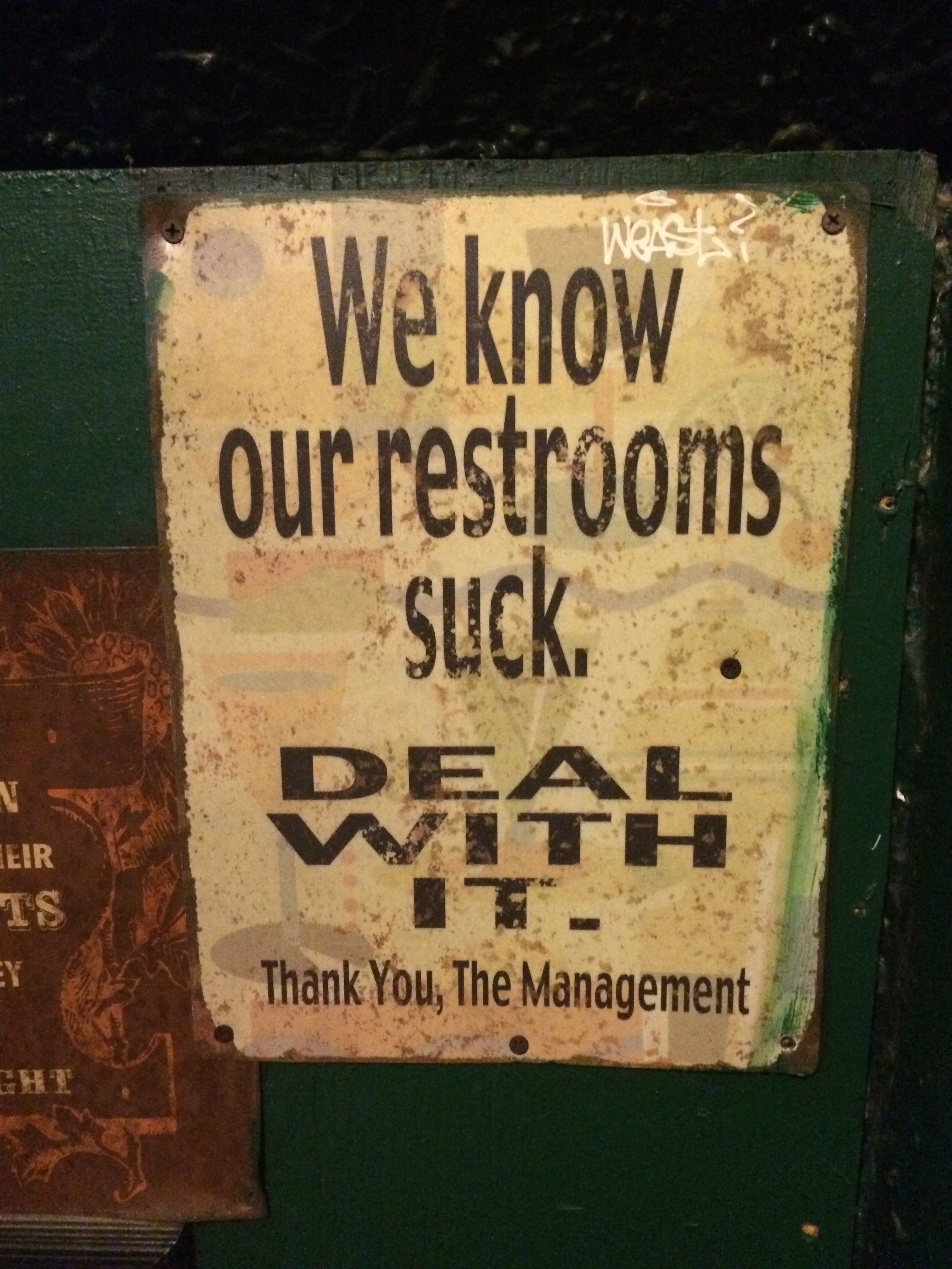 Some pretty agro signage going on in the restrooms…