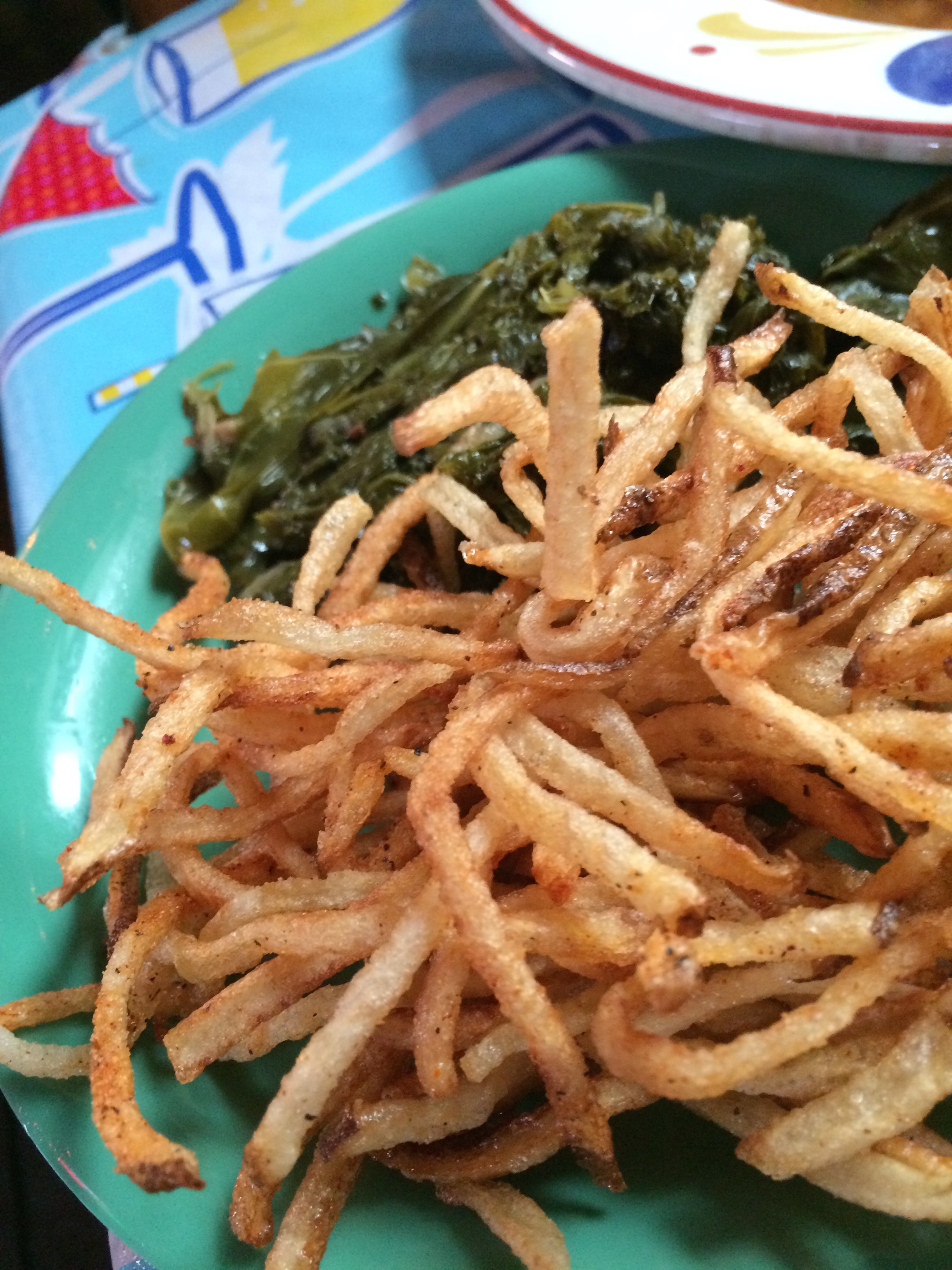 Sides of country greens and shoestring fries (SO FLAVORFUL):