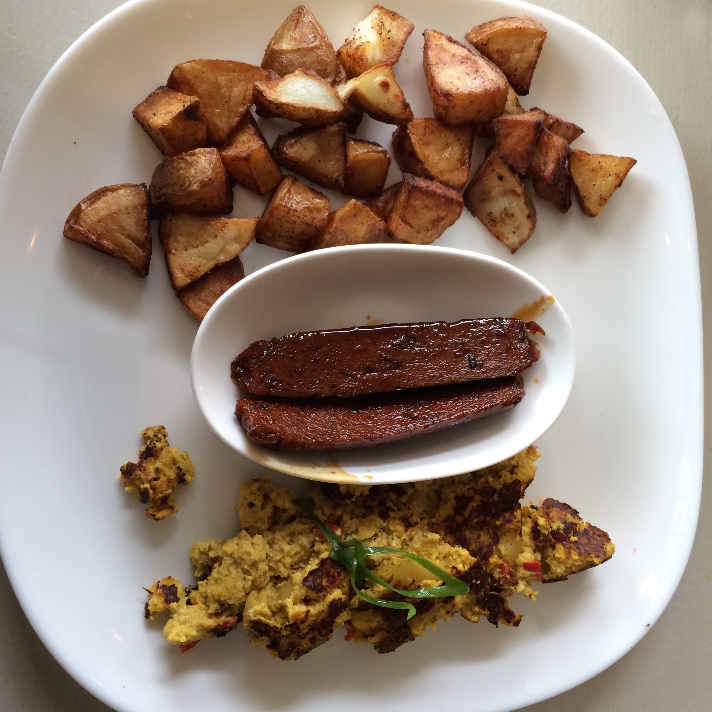 Tofu scramble, maple seitan, and potato hash: