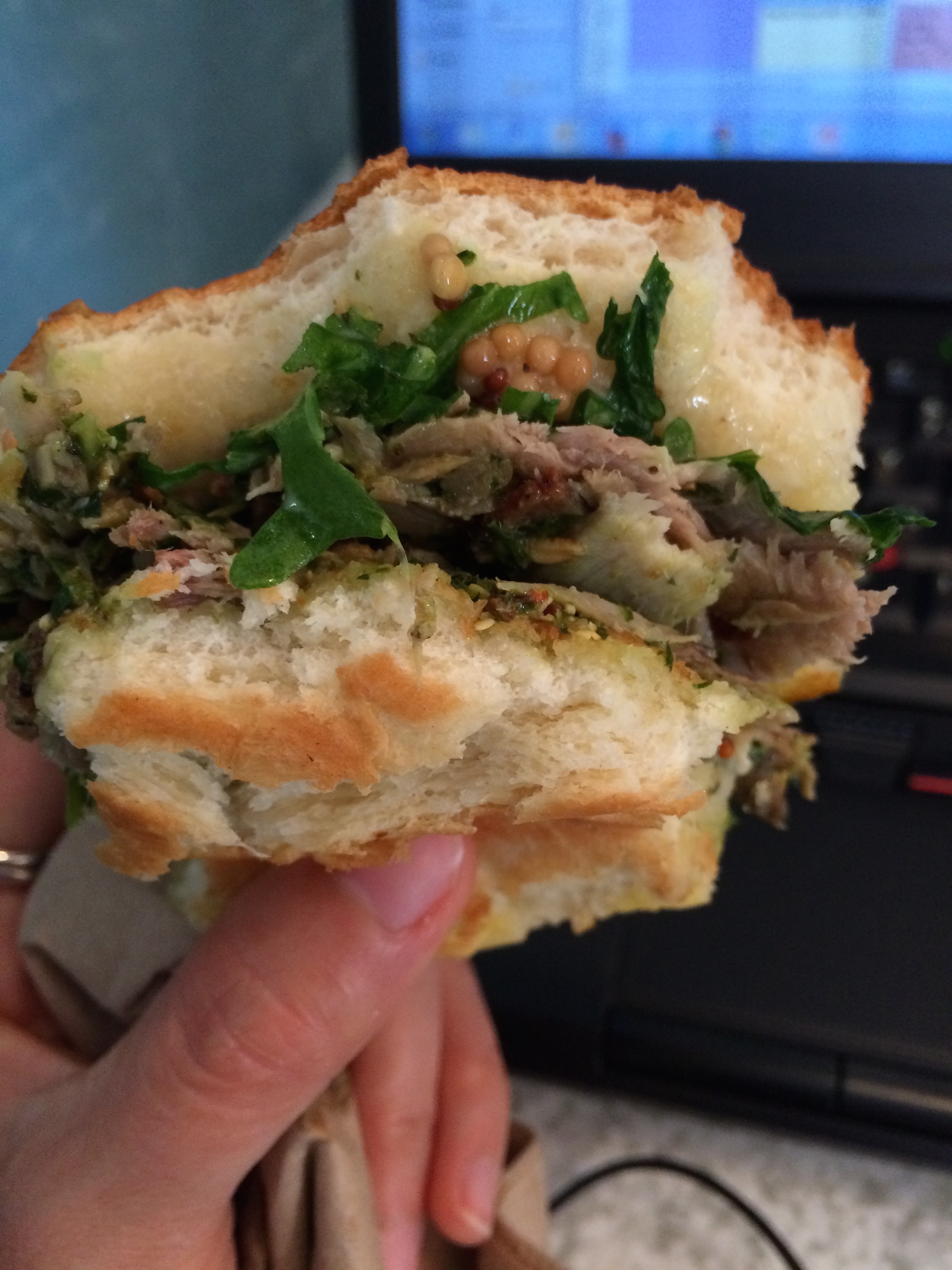 As you can imagine (and have now seen from photos), this weekend was filled with food and a whole lotta boogy-ing down. That said, come Monday morning, I decided (stupidly) to work from the hotel, since my flight was in the evening. This unfortunately resulted in a lot of unneeded stress. Which resulted in stress-eating. Life could’ve been worse, though. I could’ve NOT eaten this delectable pork shoulder sandwich pictured below.